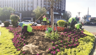 5月23日,园林工人在市区幸福街与中兴路交汇的渠化岛栽花种草。据了解,渠化岛是根据路口流量和基本特征对行人、车辆作合理分离、导流等设计,用于疏导行人、非机动车和机动车,扩大交通容量。通过花草树木与景观置石的错落搭配,使城市道路环境更加美丽。 本报记者李晓明摄