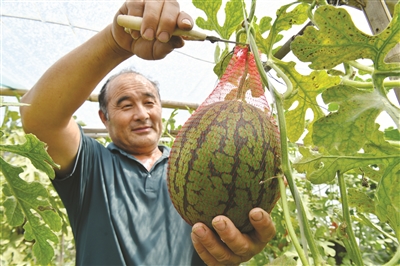 6月3日,农民在河北省盐山县盐山镇一处果蔬种植棚内收获西瓜。