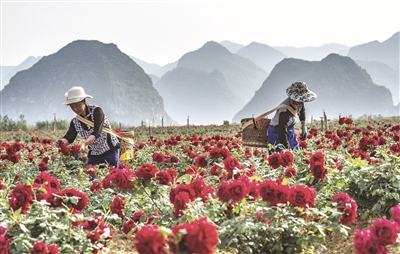 近日,在云南省文山壮族苗族自治州丘北县普者黑玫瑰花种植基地,1000多亩高原墨红玫瑰花获丰收。花农穿行于花海之间,采摘玫瑰花,用于制作玫瑰花饼、玫瑰酱、玫瑰糖等产品,供应市场。