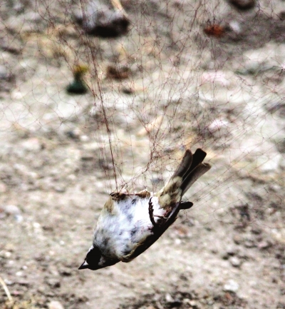 图①一只鸟在网上被活活吊死。图②执法人员收缴鸟网。图③执法人员放飞候鸟。