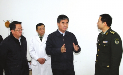 安桂武在副市长葛树立、市政府秘书长刘俊道的陪同下,先后来到65052部队和解放军第321医院走访慰问。